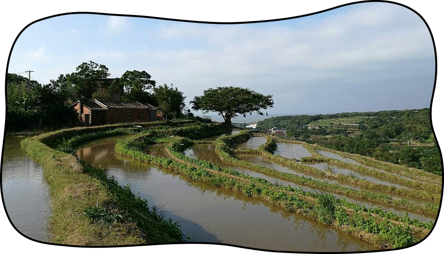 三芝背山面海,平原不廣,為了與老天爭地,先民開墾時,便往丘陵方向辛勤的開墾,才有如今這般綠意盎然的梯田景緻,其中以橫山地區的梯田為最。梯田原是以種稻作為主,如今許多稻田都已改種花卉、山藥、茭白筍等經濟作物。順應山勢地形開闢而成,一層一層的梯田美景,晨昏兩時,都有一番嬌媚的氣息,總是很自然讓人駐足欣賞。